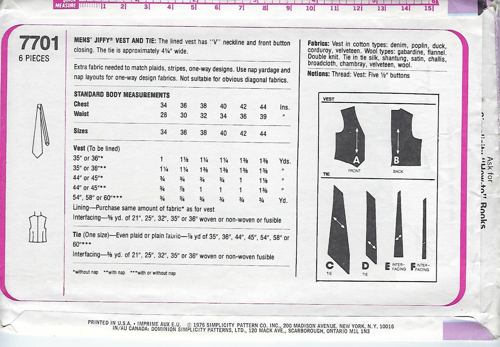 Simplicity 7701 Sewing Pattern Men S Size 34 Vest Tie Etsy